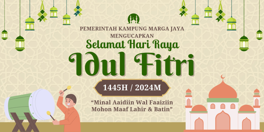 Pemerintah Kampung Marga Jaya beserta Lembaga Kampung lainnya mengucapkan “Selamat Hari Raya Idul Fitri 1445 H. Semoga pada hari 'Idul Fitri ini, seluruh masyarakat Kampung Marga Jaya bisa merayakannya dengan penuh suka cita dan saling maaf-memaafkan.