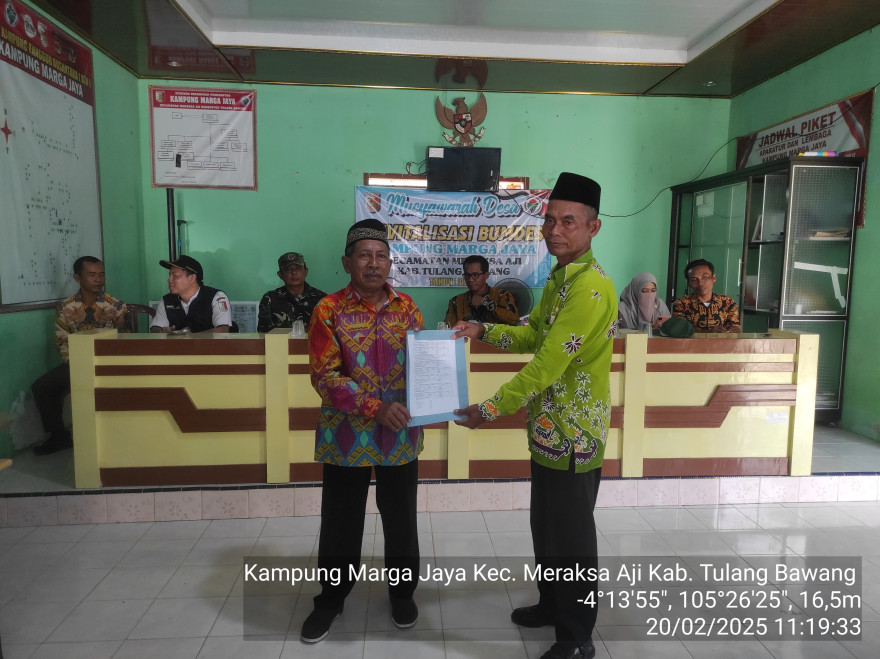 Pemerintah Kampung Marga Jaya telah melaksanakan Musyawarah Desa Khusus (MUSDESUS) Revitalisasi Pengurus Badan Usaha Milik Desa (BUMDES) tahun 2025 di Balai Kampung Marga Jaya pada 20 Februari 2025. Di hadiri oleh Kepala Kampung Marga Jaya beserta aparatur, BPK, Bhabinsa, Sekretaris Camat Meraksa Aji, Pendamping Desa, Pendamping Lokas Desa, Tokoh Agama dan tokoh masyarakat, Kepala Balai Penyuluhan Pertanian dan Pengurus Bumdes Mitra Bangsa.
